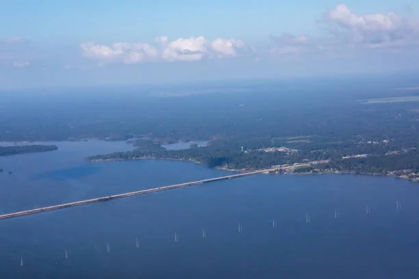 Fly over the shimmering waters of Trinity Bay with stunning views of marshlands, shoreline communities, and Texas Gulf Coast.